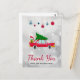 Carte de remerciement avec une vieille voiture rouge cool transportant un pin de Noël vert sur son toit et un cadeau rangé dans le coffre ouvert.