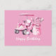 Carte postale Voiturette de golf avec golfeuse Joyeux Anniversaire rose