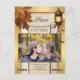 Une carte postale romantique et artistique Save the Date avec votre photo préférée encadrée par un design en or et en bois patiné avec des feuilles d'automne colorées et une lanterne festive et chaude.