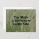 Dites "merci" à vos professeurs, tuteurs, mentors ou à quiconque ayant fait une différence dans votre vie. Le fond de cette carte de remerciement représente de hautes herbes du désert avec des tiges vertes et des plumets blancs. Cette belle photo de la nature offre des lignes verticales qui servent de toile de fond au message "Vous avez fait une différence dans ma vie" qui peut être rapidement personnalisé. Cette carte postale offre une option peu coûteuse pour les diplômés, les employés ou quiconque passant à un autre chapitre de sa vie et souhaitant exprimer sa gratitude à ceux qui les ont aidés en cours de route.