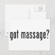 Façonné après cette publicité très populaire, nous avons ce design super mignon "Get Massage?" sur des tonnes de produits pour que vous puissiez l'utiliser sur vos cartes de visite de massage, de cartes de remerciement, ou de donner comme cadeaux clients. Disponible en noir ou blanc cassé.
