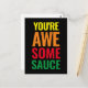 Avec le compliment "You're Awesomesauce", stylisé dans une grande police de caractères avec quatre couleurs de poivre chaud sur un arrière - plan noir solide, cette carte postale est la carte parfaite à envoyer à quelqu'un de spécial à l'occasion de la Journée mondiale du respect (1er mars) — ou n'importe quel jour que vous avez envie de faire la fête, à une fête, ou même au bureau ! © W.H. Sim. Voir plus sur zazzle.com/wordsofwhimsy