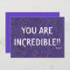 C'est une carte postale violette abstraite cool qui dit "VOUS ÊTES INCROYABLE ! !" en gros caractères blancs à côté d'un visage souriant amusant. Super d'en envoyer un à toutes les personnes incroyables de votre vie!