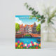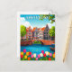 Une belle carte postale d'Amsterdam représentant les maisons emblématiques du canal, les tulipes et les ponts de la ville dans une illustration colorée de style vintage. Un souvenir parfait pour les voyageurs, les collectionneurs ou quiconque aime le charme des Pays-Bas.