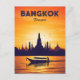 Une affiche de voyage vintage stylisée représentant le temple emblématique de Wat Arun à Bangkok, en Thaïlande, au coucher du soleil avec un bateau sur la rivière.