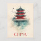 Cette carte postale de voyage s'inspire des temples chinois. Il y a une illustration de temple rouge de trois étages en aquarelle.