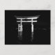 Photo en noir et blanc du grand torii debout dans la mer au sanctuaire d'Itsukushima sur l'île de Miyajima la nuit.