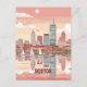 Une carte postale de voyage magnifiquement illustrée avec l'iconique Skyline de Boston, Massachusetts, avec des voiliers flottant gracieusement sur la rivière Charles. les tons pastel chauds et les reflets doux créent une atmosphère sereine et accueillante, capturant le charme historique et l'architecture moderne de la ville. la combinaison des bâtiments classiques en briques rouges, des gratte-ciel contemporains et le bord de mer paisible fait de cette représentation parfaite de la ville de Boston paysage et culture maritime.