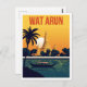 Illuminate your space with this gorgeous vintage travel poster style postcard featuring Wat Arun, the Temple of Dawn, in Bangkok, Thailand. The iconic prang (spire) is bathed in the dramatic, golden light of a sunset, silhouetted against a vibrant orange sky. A traditional longtail boat rests on the Chao Phraya River in the foreground, framed by a palm tree. This design perfectly captures the exotic beauty and tranquility of the Thai capital. It's ideal for sending greetings, collecting retro Southeast Asian art, or decorating a travel-themed space.