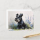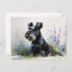 A soft watercolor-style illustration of a calm schnauzer seated among delicate blue wildflowers and meadow grasses, featuring gentle textures, a light neutral background, and a peaceful, natural atmosphere.