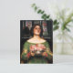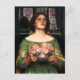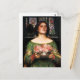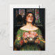 John William Waterhouse Rassemble Ye Rosebuds Tandis que vous mai carte postale. Peinture à l'huile sur toile de 1909. Basé sur le poème Robert Herrick, Gather Ye Rosebuds est l’une des plus belles oeuvres littéraires du peintre anglais John Waterhouse. Le tableau présente une belle fille en robe verte avec dentelle d'or et broderie florale. La jeune femme tient dans ses mains un bol d'étain de roses roses fraîchement coupées, rouges et blanches. Ses cheveux rouges foncés sont fixés avec des perles, et un miroir posté derrière elle révèle un vitrail orné d'un blason et de tulipes violettes. Un grand cadeau pour les amateurs de J.W. Waterhouse, d'art romantique anglais, de peinture littéraire et des Pré-Raphaélites.