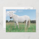 ein schönes weißes Pferd auf steht auf einer Wiese. Im Hintergrund ein blauer Himmel mit Wolken
