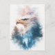 This breathtaking design features a majestic white eagle shown in a noble profile view, with its silhouette elegantly blending into a tranquil woodland scene. Created as a high-quality digital illustration in a soft watercolor style, the eagle has brilliant white plumage and a sharp, light-colored beak that conveys a sense of quiet power and watchful wisdom. The lower half of the eagle's form transitions into a dense grove of teal and deep blue evergreen trees, while a soft mist and glowing light orbs drift through the forest floor. Above the eagle, a warm sunset sky is filled with soft pink and orange clouds, shimmering white stars, and a small flock of birds flying in the distance. The overall aesthetic is peaceful, mysterious, and full of natural wonder, making it an exceptional choice for bird lovers and fans of double-exposure wildlife art. This elegant eagle postcard is a perfect choice for sending a meaningful "thinking of you" note or a powerful greeting to a friend who finds strength in the wild beauty of nature. You might choose to use this artistic card for a mountain-themed event invitation or to celebrate a professional achievement with a touch of noble elegance for your colleagues. It also makes a beautiful decorative piece for a modern rustic office wall or a stylish addition to a nature journal as a small token of forest magic. This versatile design is also an excellent choice for a housewarming message, a retirement thank you note, or as a heartwarming way to share a message of joy for any situation or event.