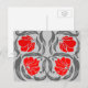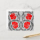 Carte postale dans un motif de textile vintage William Morris de fleurs et de feuilles de pimpernel stylisés - fleurs dans un dégradé de rouge foncé à vif, avec des feuilles grises graphite, sur un fond gris argent clair