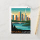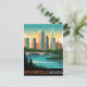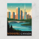 Une affiche de voyage dynamique et de style rétro pour "WINNIPEG CANADA". Il dispose d'un paysage urbain stylisé avec des bâtiments modernes de premier plan, dont une grande flèche mince. Un plan d'eau avec un pont traverse le premier plan, et il y a des arbres silhoués et des oiseaux dans le ciel. La palette de couleurs utilise des jaunes chauds et des oranges pour le ciel et les bâtiments, contrastant avec les bleus cool et les verts pour l'eau et le feuillage, évoquant une atmosphère lumineuse et accueillante.