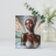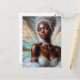 Ethereal fairy art postcard features a regal Black woman with radiant dark skin, dressed in an opulent white gown adorned with delicate feathers. Her shimmering iridescent wings glow in hues of icy blue-green, gold, and pastel, while a pearl-encrusted crown rests atop her white-hued curls. The wintry background sparkles with light, creating a dreamy, magical winter wonderland atmosphere.