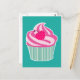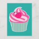 Art graphique / illustration d'un cupcake rose délicieux avec des tourbillons de glaçage sur le dessus et une jolie cerise à pois rose chaud. La base est à rayures vertes et blanches.