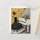 A woman with a piano print dress at a fancy white piano with a tabby cat and a gold and colorful music notes background