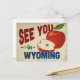 Une charmante carte postale de voyage vintage du Wyoming avec une belle pomme rouge, avec un texte amusant de style rétro qui dit, "Voir dans le Wyoming"