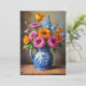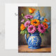 Un beau pot bleu et blanc rempli de fleurs colorées et lumineuses est imprimé sur une carte Pensées pour toi. Le texte peut être modifié ou supprimé. Image générée par IA par IveyCottage.