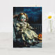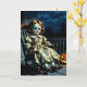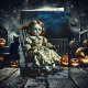 Une carte d'Halloween hantante. Une poupée hantée éffrayante dans une chaise à bascule à côté d'un citrouille d'Halloween sur un porche avant. Vibes d'Halloween hantées déplaisantes.