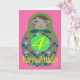 Carte d'anniversaire 4 avec l'image d'une poupée russe de forme classique avec des cercles colorés, sur un arrière - plan rose.