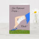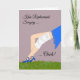 Carte pour la chirurgie de remplacement du genou avec des jambes dessinées à la main, et une fonte sur le genou gauche. Les jambes dans l'image ont une jupe bleue, et des guéridons bleus. Ses jambes sont sur un coin d'herbe peinte avec de petites fleurs orange.