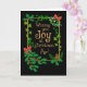 Une carte de Noël élégante pour votre grand-père, avec feuillage traditionnel de Noël, saint et faux orteils attachés avec des arcs rouges, des sprigs de lierre et de sapin et un cône de sapin, le tout sur un arrière - plan noir. La couverture d'accueil en lettres décoratives de couleur or est, 'Wishing you Joy at Christmas,' et 'Poppi!' dans une police d'écriture informelle. Le message intérieur n'est qu'une suggestion et vous pouvez facilement le customiser pour répondre à vos besoins ou le supprimer complètement si vous préférez une carte "Blank Inside".