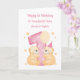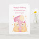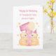 Cette carte d'anniversaire rose est adaptée pour des jumelles. Le design comprend deux ours en peluche aquarelle qui enlacent un chiffre 1 à pois, un chapeau de fête, un ballon et des étoiles.