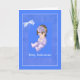 Cette jolie carte est bleu moyen, un petit bébé violet, qui porte un arc violet sur ses cheveux foncés. Il y a une bordure à pois avec un arc blanc entourant le bébé et une mince bordure blanche. Merci à Designs by Elena pour l'oeuvre d'art pour bébé.