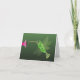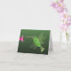 Beau colibri au corps irridescendant planant sur une fleur rose. Conception vectorielle sur carte pour notes vierge pour les amateurs d'oiseaux.