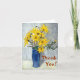 Carte pour notes de "Merci" fleuri avec des tournesols dorés dans un grand vase bleu, d'un tableau pastel original à l'huile de Judy Adamson. Le lettrage est en brun rouillé.