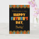 Une carte de voeux de Fête des pères design pour votre père, dans un style Art déco. Le message d'accueil à l'avant est : "Je vous souhaite une FÊTE DES PÈRES très HEUREUSE, papa !" en rouge vif, bleu et jaune doré sur un arrière - plan noir. Il y a des motifs Art Déco incurvés en haut et en bas et le message intérieur est juste une suggestion que vous pouvez facilement changer ou supprimer complètement si vous le souhaitez.