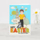Illustration d'une petite maison mignonne dans un quartier avec un ciel bleu et des oiseaux chanteurs jaunes créent une sensation printanière à cette adorable carte de Pâques pour votre Godson.