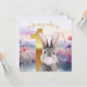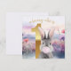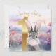 Premier anniversaire lapin gris soufflant une gomme à bulle rose dans un champ fleur sauvage "un lapin qui est" texte au-dessus d'un numéro d'or un