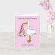 Une simple illustration d'une cigogne blanche tenant un bébé dans un drap blanc qui pend de son bec. Le drap comporte des cœurs rouges et l'image est placée sur un fond de couleur rose pâle. Les mots « Joyeux premier Saint-Valentin en tant que nouveaux parents » accompagnent l'image.