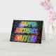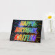 Cette carte de voeux d'anniversaire multicolore et amusant comprend le message "HAPPY BANTHDAY", et le prénom commun "KAITLIN" avec les lettres ayant un spectre arc-en-ciel coloré comme motif de couleur dégradé. L'arrière - plan du devant présente également un motif coloré inspiré par l'allure d'un feu d'artifice festif. L'intérieur comporte un message de salutation personnalisable, ou peut-être peut-être être effacé et laissé vide si un message doit être écrit à la main à la place. Une telle carte de voeux pourrait être une façon amusante de célébrer l'anniversaire de quelqu'un du nom de Kaitlin. [~Z0000350]