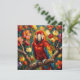 A blank notecard that you can write your own message in. On the front is an impasto painting style colorful red, blue and yellow Macaw and flowers.