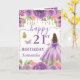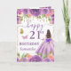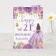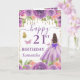 Un design luxueux violet et or pour un 21e anniversaire mettant en vedette une belle princesse brune dans une robe de bal violette fluide ornée de détails dorés scintillants et d'un nœud spectaculaire, entourée de roses violettes et roses riches, d'accents dorés scintillants et de papillons délicats. Des perles dorées suspendues et des éléments floraux encadrent la composition, tandis qu'une typographie de milestone audacieuse ajoute une touche moderne et festive. La palette de tons de joaillerie, les reflets métalliques et la silhouette élégante de princesse créent une esthétique glamour, féminine et enchanteresse parfaite pour une célébration importante.