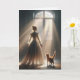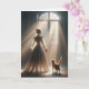 Une jeune femme en dentelle se tient à côté d'un chat, regardant par une grande fenêtre la lumière du soleil qui pénètre, illuminant la pièce d'une lumière chaude. Le texte intérieur est modifiable.