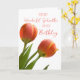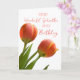 Carte d'anniversaire pour marraine avec tulipes à ressort orange et rose et verset réfléchi.