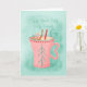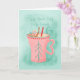 une tasse rose et turquoise avec une poignée de coeur et un arbre de vacances minimaliste rempli de cacao chaud, crème fouettée, sucre de canne, bâtons de cannelle, et des sprigs de menthe poivrée : "Profitez de votre journée — Cosy Cocoa" Intérieur : "Pensez à vous — espérez que vous apprécierez votre journée."