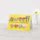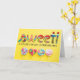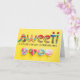 Colorful congratulations card featuring the message, "sweet! I heard you got a promotion!" with letters in the word, "sweet" made from rainbow candy illustration. Bright yellow background with brightly-colored, swirly lollipops background. Inside can customized to fit your needs.