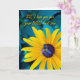 Carte de prompt rétablissement pour une sœur. La carte comporte une photo de fleur de Susan aux yeux noirs et une abeille au milieu de la fleur. Sœur, j'espère que tu retrouveras ton bourdonnement bientôt, texte jaune sur la couverture. Schéma de couleurs jaune vif, bleu-vert et marron. Art, image et vers copyright © Shoaff Ballanger Studios, 2022.