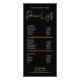 Carte de prix en rack de luxe de services en noir et faux or avec espace pour votre logo, les détails d'affaires et votre prix de services. Parfait pour un menu de prix pour votre salon ou boutique. La police de script fausse or moderne ajoute une touche chic et tendance à cette carte de rack guide de tarification. Utilisez-le comme un menu de services pour le lash & brows, bar à ongles, salon de coiffure ou tout autre produit ou service.