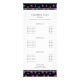 Carte de rack de service d'entreprise de salon pour animaux de compagnie professionnel noir et blanc simplement élégante avec empreintes de pattes pailletées violettes, roses et bleues. Personnalisez-le avec votre nom, profession, slogan, numéro de téléphone, adresse (sur le devant et le dos) et jusqu'à six services avec cinq descriptions et prix correspondants par service (trois sur le devant et trois sur le dos). Parfait pour les salons pour animaux de compagnie et les toiletteurs pour animaux de compagnie.