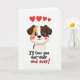 This greeting card shows a cartoon puppy’s head and upper body centered on a plain white background. The pup has creamy white fur with warm tan and chocolate-brown patches, plus rosy blush on its cheeks and a sweet, slightly shy expression. Its big black eyes have tiny white highlights, making it look sincere and attentive. Above the puppy, four red hearts float like a little halo, getting smaller from left to right to suggest a gentle shower of love ❤️. Beneath the illustration, the card reads “I’ll love you fur-ever and ever!” in a hand-lettered style that feels casual and friendly. The words “and ever!” stand out in red, matching the hearts and tying the message together 💌. With its simple layout and affectionate theme, it’s a lovely way to celebrate loyalty and care, especially with a little nod to sweets like 🍫. Hope it helps you share heartfelt Valentine’s Day sentiments with someone you care about.