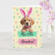 Designed with a golden-furred puppy centered in the scene, this card shows bluish, soulful eyes looking straight ahead as if meeting a friend’s gaze. Oversized plush pink bunny-ear coverings sit on its head and are tied under the chin with a striped bow, adding a sweet 🐰 touch. A bright pink collar with a faint pattern frames its neck and gives the pup a dressed-up, affectionate look. The puppy’s front paws rest on a mint-green banner that runs across the lower middle, carrying a celebratory message in dark lettering. Just beneath it, a rosy-pink banner tilts at a similar angle and holds a shorter line of text in a lighter tone, creating a gentle layered effect. Behind everything, a soft yellow background glows with scattered pastel dots in pink, pale green, and light blue, like confetti drifting through spring air 🌷. Fine highlights pick up the texture of the fur around the cheeks and paws, while the banners cast small, tidy shadows on the yellow field. The mint-green strip sits slightly above the rosy-pink strip, both angled to the right against the dotted yellow backdrop.