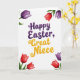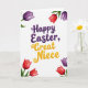 Designed with a bright spring look on a white background, this card centers on the words “Happy Easter, Great Niece” in two contrasting colors. “Happy Easter” sits prominently in deep purple lettering with gentle shading, giving it a soft, slightly textured look. Just beneath it, “Great Niece” appears in warm golden yellow, like sunshine against the white space, and the two lines feel like they belong together, like a close hug between family members. The lettering has flowing curves and a light bounce, adding a friendly, affectionate tone without needing extra decoration. In each corner, stylized flowers frame the message, with petals in rich red and dark purple and slim green stems that lean inward as if gathering around the greeting 🌷. The corner florals balance the layout so your eye naturally returns to the center text, keeping everything easy to read. The red and purple blossoms sit at all four corners, with small green leaves and subtle shadowing around the petals 🐰.