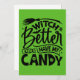 Ce design sur le thème d'Halloween présente la phrase ludique "Witch Better Have My Candy" disposée dans une mise en page dynamique et mixte. Le mot "Witch" est affiché en lettres grasses et block, tandis que "Better" est écrit dans un script cursif et fluide, ajoutant un sentiment d'urgence et d'amusement au design. La phrase "Have My" est entourée d'une bannière, soulignant encore plus la demande. Le mot "Candy" se démarque en bas en grandes lettres block, avec des illustrations de crânes intégrées dans le design. Des éléments supplémentaires d'Halloween, tels qu'un balai de sorcière, une chauve-souris, une étoile et des bonbons enveloppés, sont dispersés dans la composition, renforçant l'atmosphère effrayante et festive.